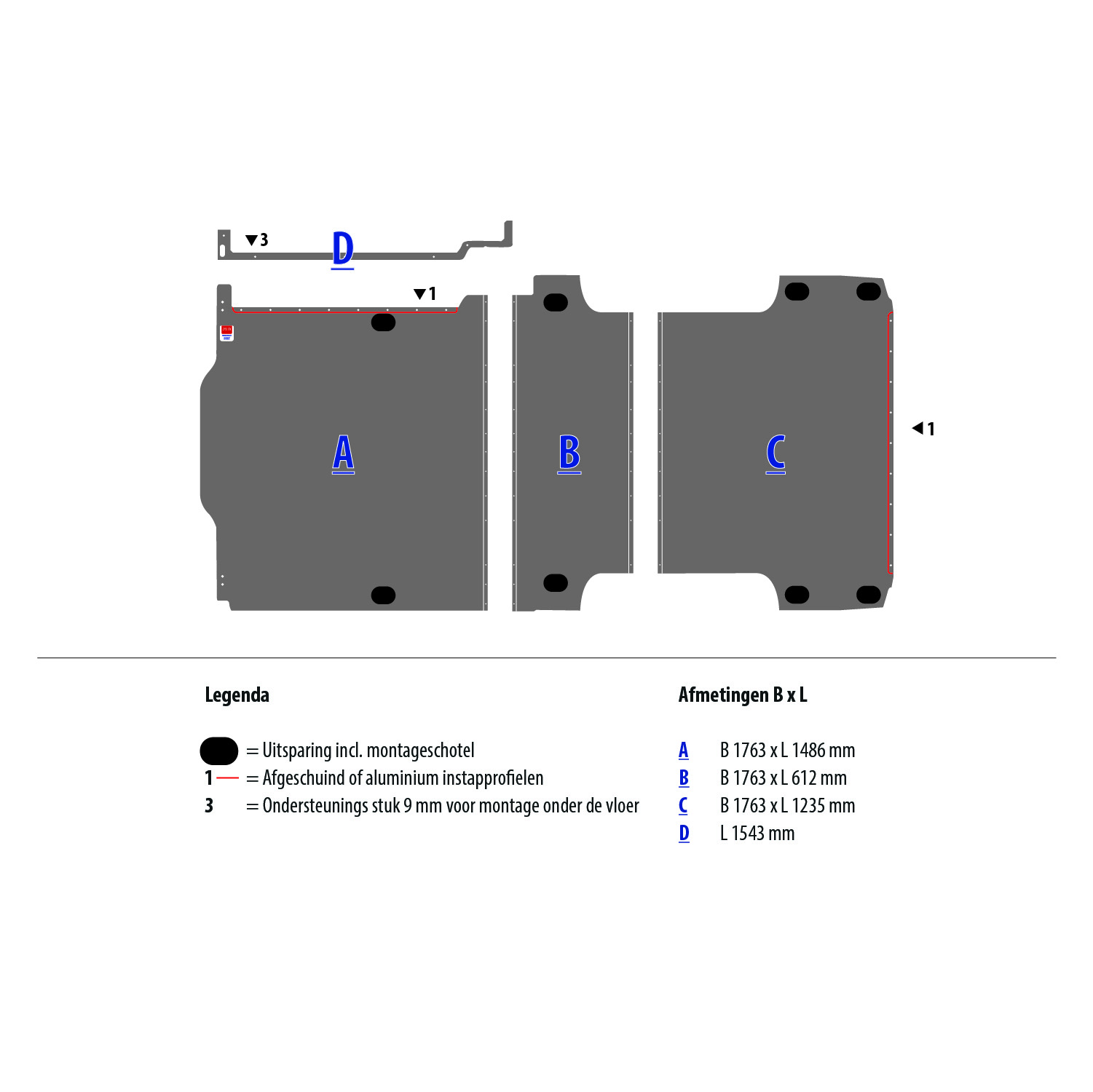 De vloeren zijn kant-en-klaar bewerkt voor de meest gangbare bestelautomodellen op de Europese markt en zijn inclusief alle bevestigingsaccessoires voor verschillende bestelwagenuitvoeringen.