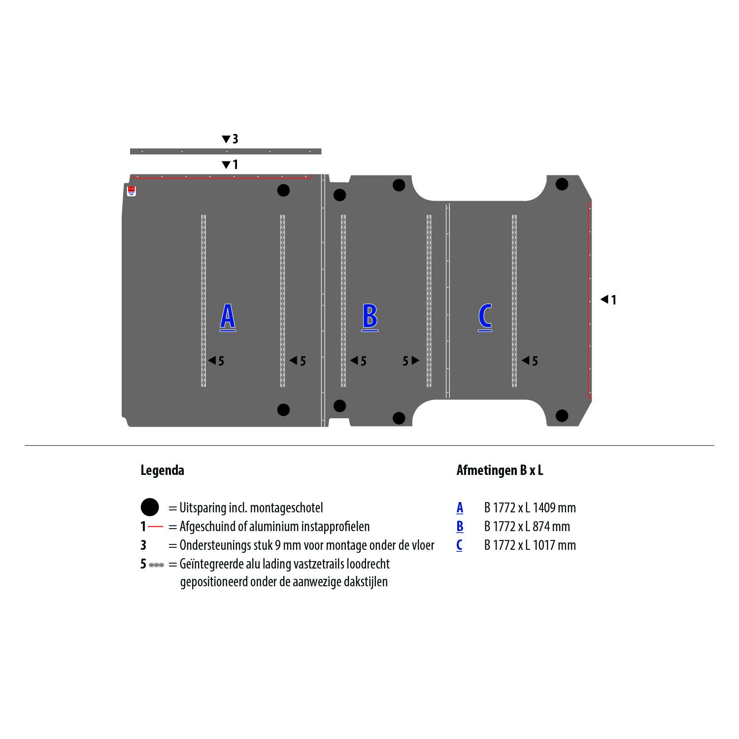 De opties in de scrollijst zijn standaard vloerplaten en gebaseerd op een wagen met een standaard fabrieksscheidingswand en achterdeuren. Indien uw gewenste ‘standaard’ vloerplaat niet in de scrollijst staat vermeld, dan gelieve ons te mailen naar verkoop@zevim.nl of via het contactformulier.
