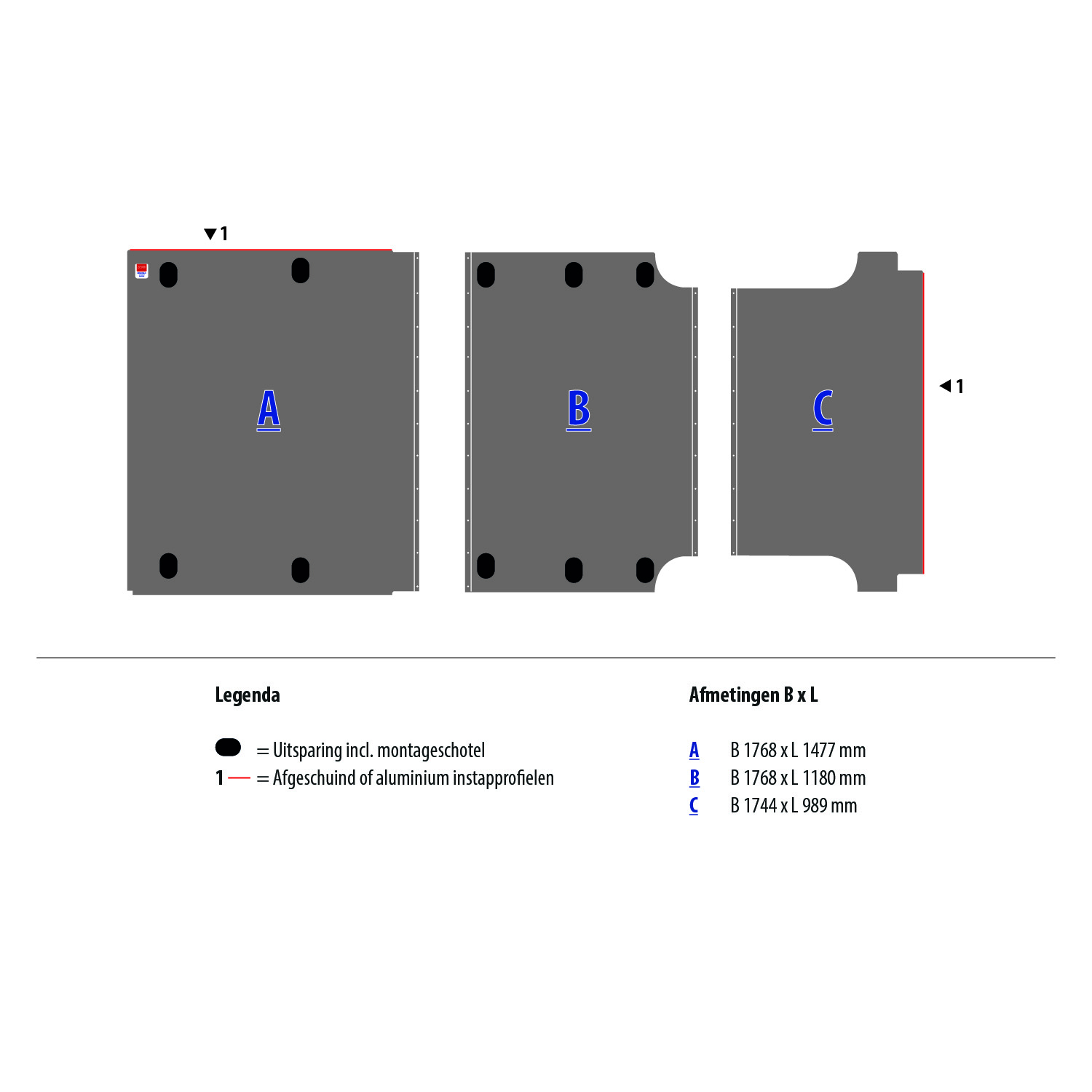 De vloeren zijn kant-en-klaar bewerkt voor de meest gangbare bestelautomodellen op de Europese markt en zijn inclusief alle bevestigingsaccessoires voor verschillende bestelwagenuitvoeringen.