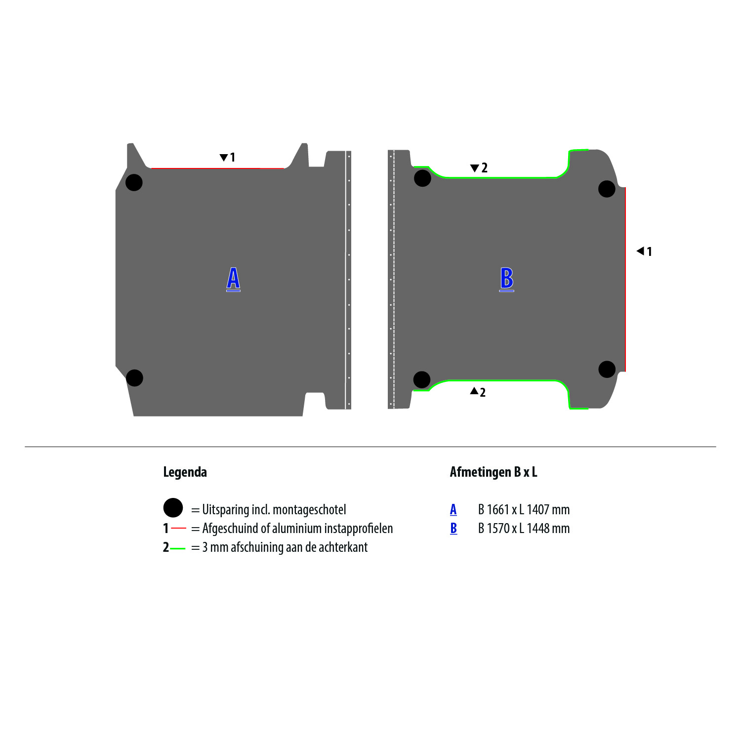 De opties in de scrollijst zijn standaard vloerplaten en gebaseerd op een wagen met een standaard fabrieksscheidingswand en achterdeuren. Als uw gewenste ‘standaard’ vloerplaat niet in de scrollijst staat vermeld, dan gelieve ons te mailen naar verkoop@zevim.nl of via het contactformulier.
